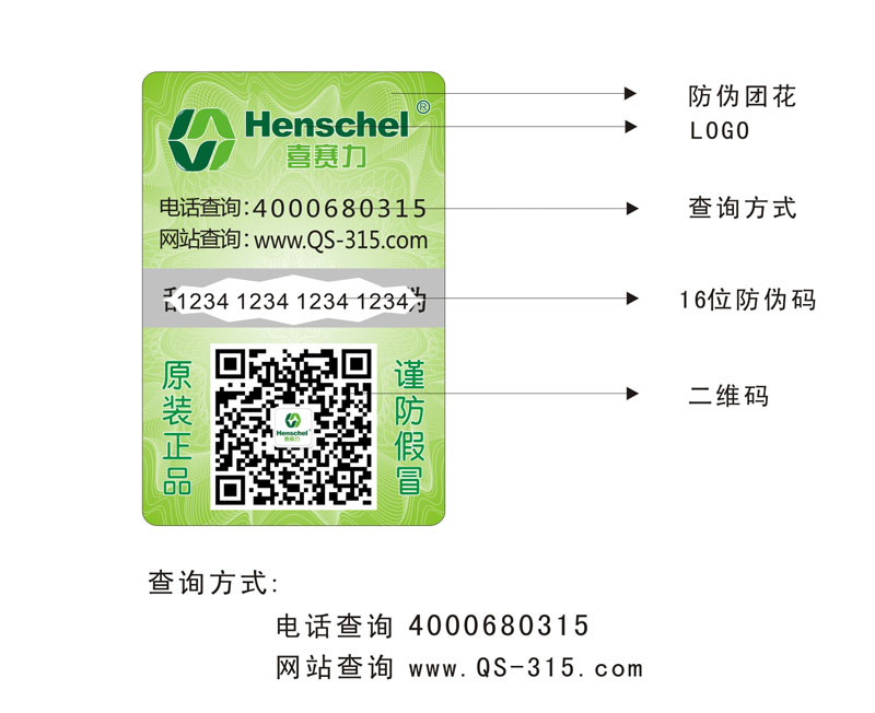 新型防伪标签为“刮开式”,面层是可去除的银粉薄膜,次层是易碎膜,一次性使用,揭下失效,涂层底下喷印防伪身份码,每个产品的防伪身份码都是唯一的,按照提示方法可查询(电话、网站查询)真伪,每个数码只提供一次性查询。