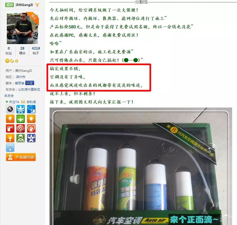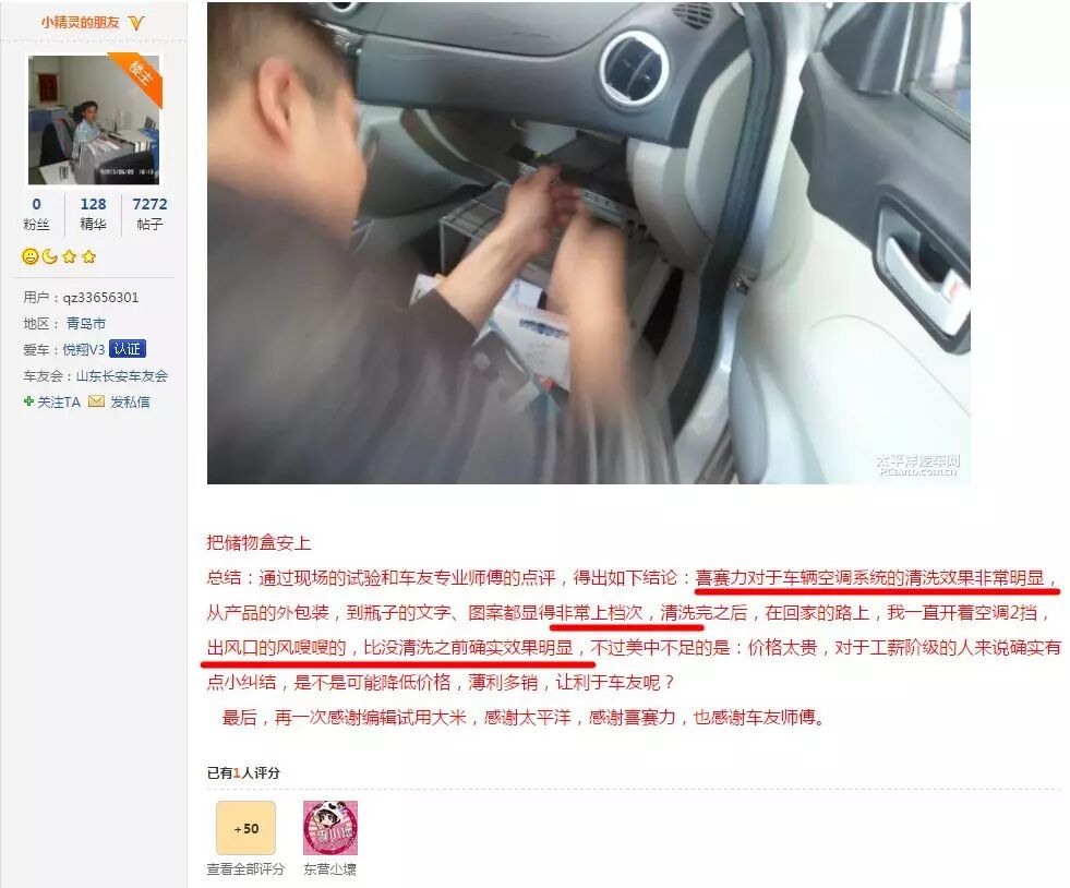 从车友们的“作业”中发现,在日常驾车中,汽车空调异味大、制冷效果差,使用过的产品效果不明显等问题的确让他们很困扰。凡是试用了喜赛力汽车全能型空调套装的,都认为效果非常明显,为他们带来了全新感受:分段式清洗全能型套装对空调“照顾”得很周到,保养后车内没有了异味,空气还带点小清新,制冷比以前快了,操作也很简单方便,开车心情也舒畅了…给予了产品高度好评和大力支持。喜赛力实实在在帮车友们解决了问题。